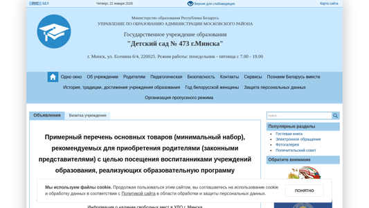 | AI-анализ | The web project "Детский сад № 473 г. Минска" (Child Care Center № 473 in Minsk) is a government educational institution based in Minsk, Belarus, located at ul. Yesenin 6/4, 220025. The site provides information on the preschool's schedule, administrative procedures, and various services. Cookies are used on the site, and users agree to their usage and data processing upon continuing to browse. The site includes a map, links to the Ministry of Education and other related organizations, and information on fees, vacancies, and consultations. The preschool's schedule and administration hours are Monday to Friday from 7:00 AM to 7:00 PM. The site is available in both Russian and Belarusian languages. |