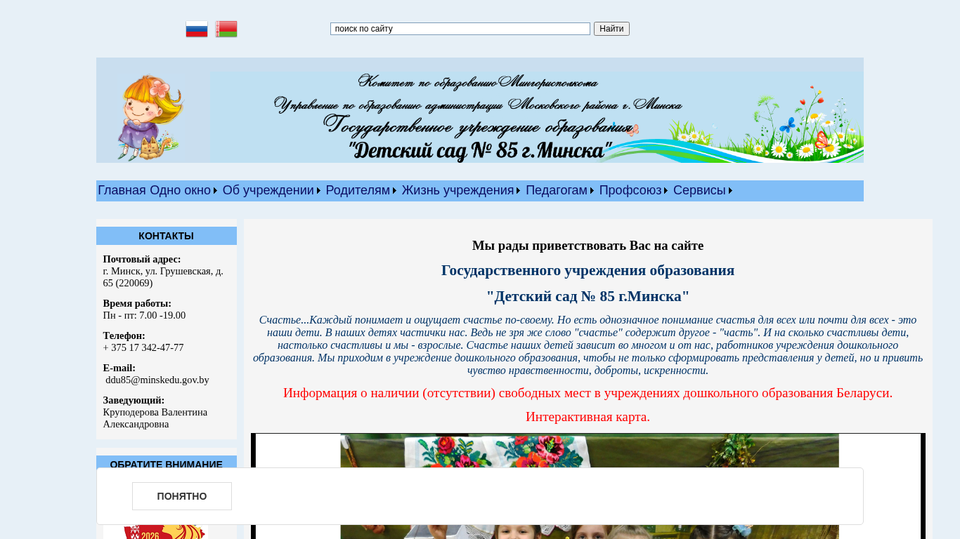 Этот онлайн-ресурс является веб-сайтом для ясли-сада №85 в Минске, Беларусь. Заголовок сайта — "Ясли-сад №85 г. Минска" (Kindergarten #85 in Minsk). Раздел описания сайта содержит различные сведения о ясли-саде, включая административные процедуры, часы работы и контактную информацию для различных услуг. Сайт также включает разделы для популярных запросов, доверительных сервисов и электронных форм для подачи заявок. Введение в работу ясли-сада и его функции в области дошкольного образования излагаются, а также информация о административном органе, педагогическом составе и государственных символах Беларуси. Сайт включает разделы по безопасности и защите, а также правила и нормы для родителей. Упоминаются родительский совет и различные комитеты, вместе с информацией о воспитателе-инспекторе.