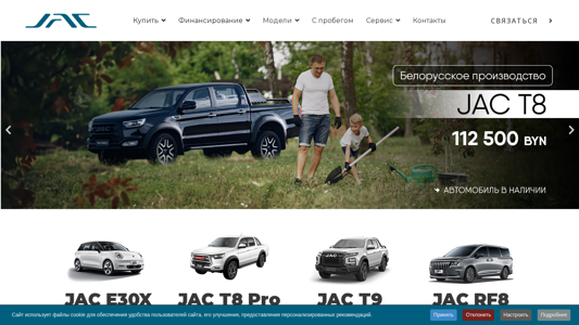 Этот онлайн-ресурс является веб-сайтом официального дилера JAC Motors в Минске, Беларусь, предлагающим продажу новых автомобилей JAC Motors. Сайт предоставляет информацию о модельном ряде, характеристиках и ценах различных моделей JAC Motors. Дилер расположен в Минске, Беларусь. Ключевые слова, ассоциируемые с сайтом, включают 'jac', 'автомобиль', 'дилер', 'доступность', 'техническое обслуживание', '743', 'кубковый файл', 'файлы куки', и 'покупка'. Сайт предлагает возможности по обмену, финансированию, лизингу и техническому обслуживанию автомобилей JAC. Также он предоставляет информацию о компании, новостях и различных моделях автомобилей JAC, таких как E30X, T8 Pro, T9, и RF8. Сайт позволяет пользователям бронировать встречи на обслуживание онлайн, просматривать электронное руководство по эксплуатации и оставлять отзывы.