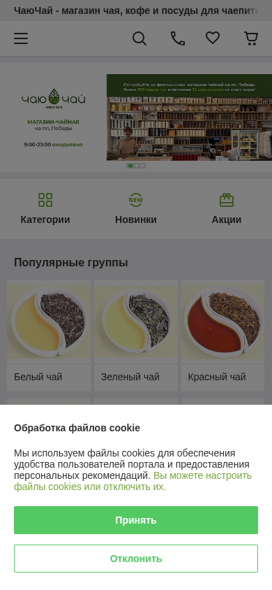 The portal chinatea.by is an online tea shop based in Minsk, Belarus, with ten physical stores across the city. The store offers a wide range of Chinese teas including Ulong, Pu-er, Da Hong Pao, and more. Customers can contact the shop at 8 029 655 57 97 for inquiries or orders. The website features categories for new items, sales, and popular tea groups such as white, green, red, and oolong teas. Prices listed are in Belarusian rubles. The site also offers a selection of tea-related items such as a glass tea pot, and various teas are available for purchase including Shu Pu-er, Jin Jun Mei, and Dark Ulong Da Hong Pa. The site was created using the Deal.by platform.