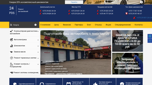 Этот онлайн-ресурс под названием "СТО Московский район - Ремонт авто, цены, Минск | Автосервис 24pds," является сервисом по ремонту и обслуживанию автомобилей, расположенным в Минске, Беларусь. Сайт предлагает различные услуги, включая диагностику двигателя, трансмиссии и электронных систем, ремонт тормозной системы, подвески и электрических систем, обслуживание шин и продажу автомобильных запчастей. На сайте представлена скидка 20% на комплексное накачивание шин, а также предоставляется контактная информация для множества услуг, включая продажи, диагностику и ремонт. Компания использует передовые компьютеризированные диагностические инструменты, такие как KTS 570 AUTOCOM VAS 5054, VCDS LAUNCH M-DIAG PRO (FULL SOFT), BMW K, DCAN RENAULT Clip, Ford/Mazda VCM, GM/OPEL.