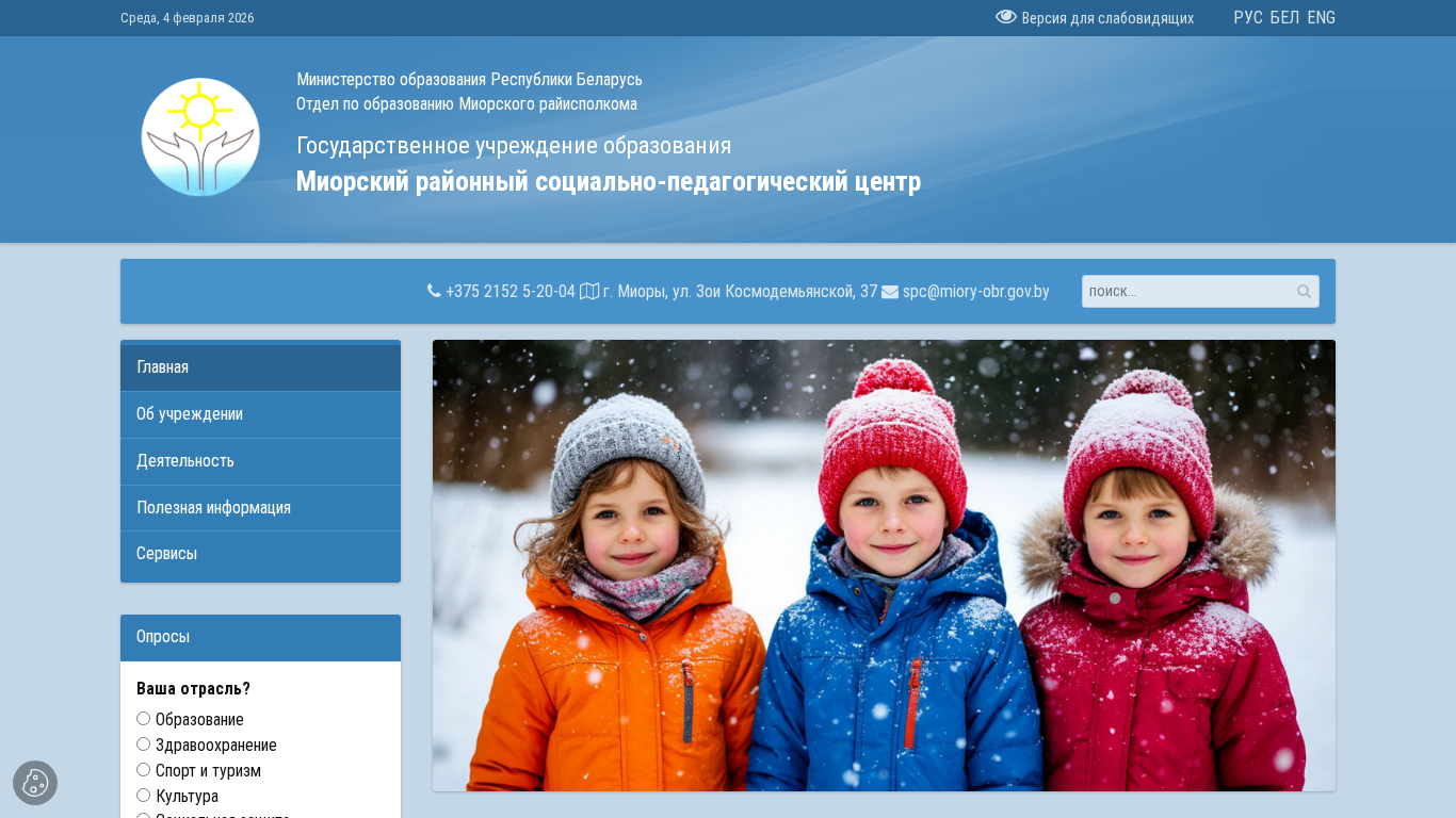 | AI-анализ | --- This website is the official page of the Miorsky District Social-Pedagogical Center in Belarus. It was last updated on February 4, 2026. The website is accessible in Russian, Belarusian, and English languages. The Ministry of Education of the Republic of Belarus manages this state educational institution located in the city of Miory, on Zoia Kosmodemyanskaya Street, number 37. The contact number for the center is +375 2152 5-20-04. The website includes a regional map of assistance, information on the state symbol, and an interactive map of the center. The year 2026 is marked as the Year of the Belarusian Woman. The website also provides phone numbers for trusted services and emergency psychological assistance. Visitors can find recent news about the district, region, |