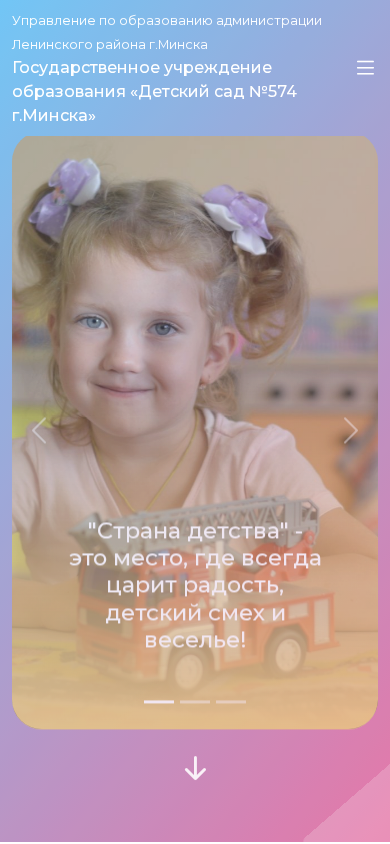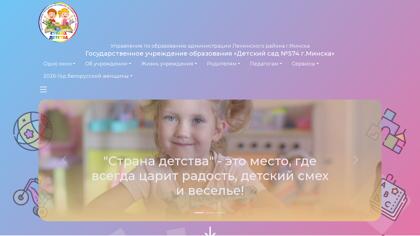 | AI-анализ | This website is a government educational institution in Minsk, Belarus, named "Детский сад №574". The title of the website is not explicitly stated in the provided data, but it can be inferred from the domain name. The description mentions it as a "Детский сад" or "Children's Garden". The top keywords include words related to education, administration, and contacts. The website has a large number of pages about the size of text (A+ and A-), and it uses a light color scheme with some images. The main sections of the website include information about the management, admission procedures, popular requests, and various services. The website also has a section for parents, including a parent's university and cafeteria information. The website is operated by the administration of the Leninsky district in Minsk. |