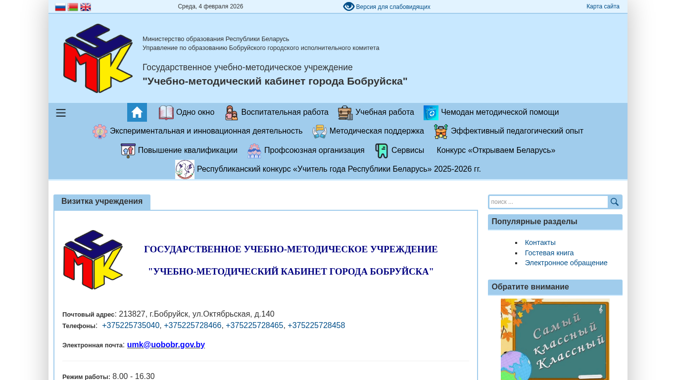 | Адрес | УЧЕБНО-МЕТОДИЧЕСКОЕ УЧРЕЖДЕНИЕ, "УЧЕБНО-МЕТОДИЧЕСКИЙ КАБИНЕТ ГОРОДА БОБРУЙСКА", Почтовый адрес, : 213827, г. Бобруйск, ул. Октябрьская, д.140 |