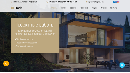 | AI-анализ | The website Inproekt.by is a project organization providing architectural, design, and construction services for private residential and small to medium business buildings in Belarus. The website offers the calculation and design of structural constructions of any complexity, including foundations, coverings, and roofs. The services range from architectural design to construction documentation and engineering consultancy. The keywords suggest that the company specializes in the design of private homes, cottages, and architectural services, with a focus on engineering, design, and project management. The top words indicate that the company offers services related to the entire process of building a home, from design to construction, with guarantees, discounts, and customer testimonials available. The company's contact information is provided, including a phone number and email address. The website offers pricing for architectural design, construction design, and home redesign, with the prices starting at 20 |
