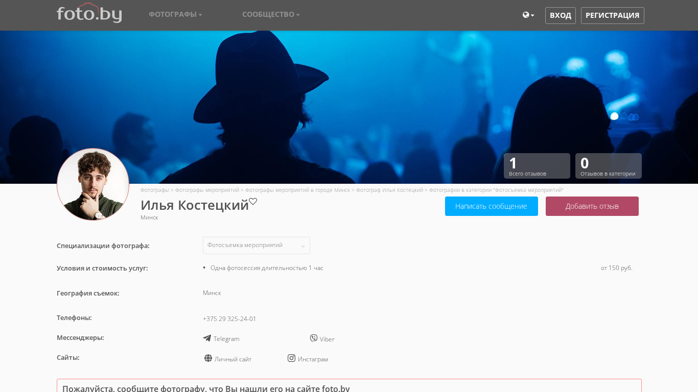 | AI-анализ | Портал является фотографическим сайтом Ильи Костецкого, фотографа, базирующегося в Минске, Беларусь. Сайт включает каталог фотографов с значительным акцентом на категории "Фотосъемка мероприятий". Работы Ильи представлены под этой категорией. Он предлагает услуги по фотографированию в Минске и прилегающих районах. Сайт предлагает различные виды фотографических услуг, включая съемку мероприятий, корпоративную фотографию, фотосъемку выпускников, свадебную фотографию, клубную фотографию, концертную фотографию, автомобильную фотографию, фотосъемку истории любви, интерьерную фотографию и индивидуальную фотографию. На сайте также есть сообщество фотографов и блог. Сайт был доступен для просмотра 03.02.2026 года и получил один отзыв в категории съемки мероприятий. Специализация Ильи Костецкого включает в себя съемку мероприятий, корпоративную фотографию, фотосъемку выпускников. |