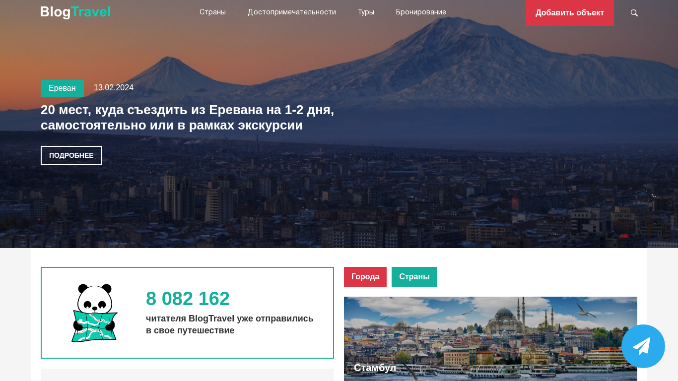 The web project BlogTravel is a BY. domain online travel assistant, focusing on Europe, Abkhazia, Austria, Azerbaijan, Albania, Armenia, Belarus, Belgium, Bolgavia, Britain, Vengaria, Germany, Greece, Georgia, Denmark, Spain, Italy, Cyprus, Crimea, Latvia, Lithuania, Moldova, Netherlands, Norway, Poland, Portugal, Russia, Rumania, Serbia, Slovakia, Slovenia, Ukraine, Finland, France, Croatia, Chernogoria, Czechia, Swizerland, Sweden, Estonia, Asia, Vietnam, Israel, India, Kazakhstan, Kyrgyzstan, OAE, Thailand, Turkey, Uzbekistan, Sri-Lanka, Japan, Africa, Egypt, Marocco, Seychelles, Tanzania,