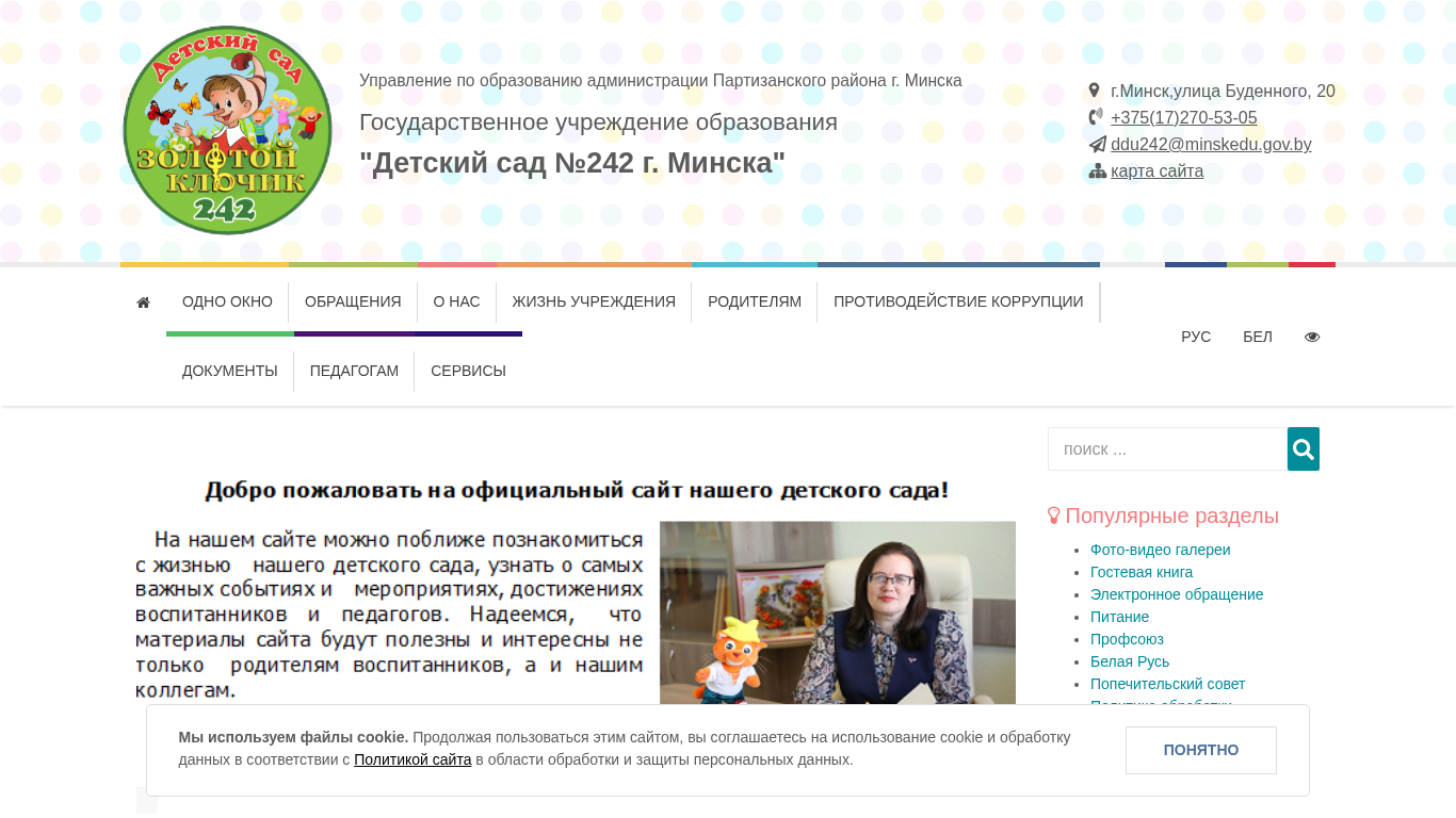 | AI-анализ | Проект веб-сайта "Детский сад 242" представляет собой интернет-ресурс для государственного образовательного учреждения "Детский сад №242" в Минске, Беларусь. Сайт предоставляет информацию о процедурах управления детским садом, контактных данных и различных нормативно-правовых актах. Пользователи могут найти детали о расположении детского сада, графике работы и составе первичной профсоюзной организации. На сайте также представлены интерактивные карты, информация о лицензиях и форма для обращений. В описании указываются миссия, задачи и функции детского сада, а также подробности о персонале, включая педагоги и музыкального директора. Сайт содержит информацию о процедурах безопасности, руководстве родителей и различных политиках, включая политику конфиденциальности данных. Работает сайт под оперативным управлением Администрации образования Партизанского района Минска. |
