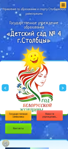 --- The website <sad4.stolbtsy-edu.gov.by> is dedicated to the Kindergarten No. 4 in the city of Stolbtsy. The title and description of the website indicate that it is an educational institution. The most frequently used words on the website include "kindergarten," "city," "news," "contacts," "year," and "education." The website provides information on the kindergarten's management, admission process, tasks and functions, pedagogical staff, history, and policies regarding personal data and cookies. It also offers a one-stop service for document issuance, administrative procedures, and emergency assistance for disabled individuals. The website includes a structure of the educational institution, application forms, telephone directory, and various normative documents. It also provides information on educational processes, goals and tasks of preschool education, and schedules for various