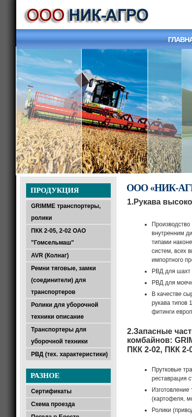 This online resource, titled "ООО «НИК-АГRO»," is a leading supplier of transport vehicles, rollers, RVD (Rubber Vacuum Drives), fittings, and high-pressure hoses in Belarus. The website provides information about GRIMME transport vehicles and rollers, PKK 2-05 and 2-02, OAO "Гомсельмаш" AVR (Kolnag) hoses and fittings, and spare parts for various uptake and uboorochny (harvesting) machinery including Grimme, Holmer, Ropa, Dewulf, Vervaet, and PKK 2-02, 2-05, AVR (Kolnag). The resource also offers repair and restoration services for pneumatic transport systems
