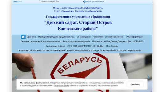 | AI-анализ | --- The web project "Островская начальная школа" (Ostrovskaya Primary School) is a website belonging to the State Educational Institution "Children's Kindergarten in the village of Old Ostrov, Klichevsky District" of the Ministry of Education of the Republic of Belarus. The site provides information about the kindergarten's schedule, administrative procedures, contacts, and popular inquiries. Keywords associated with the website include 'education', 'children', 'institutions', 'people', 'help', and 'email'. The website uses cookies and has a standard layout with adjustable font size and spacing. The main topics covered on the site are the Ministry of Education, administrative procedures, and frequently asked questions. The site includes information about enrolling a child in the kindergarten, the kindergarten's schedule, and emergency procedures. The site also |