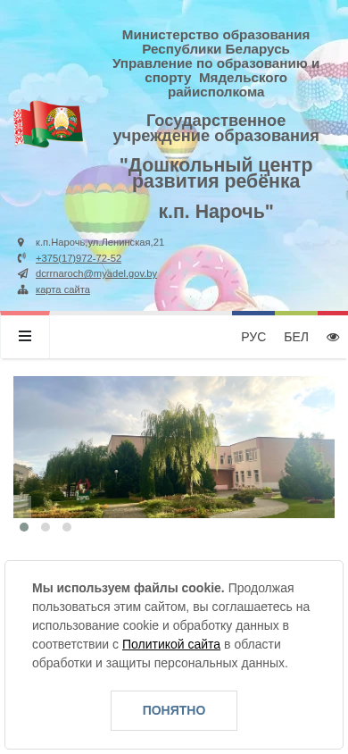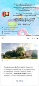 | AI-анализ | This website is for the Kindergarten Development Center for a Child in Naroch, an educational institution under the Ministry of Education of Belarus, Miaadel Regional Executive Committee, and the Miaadel District Education and Sports Administration. The website provides information about the kindergarten's structure, tasks, and functions, as well as contacts, working hours, and administrative procedures. It includes sections for the administration, staff, and rating evaluation, as well as policies on confidentiality, ideological work, and pedagogical workers. The website also features a photo-video gallery, information on the history and traditions of the institution, and a canteen menu. Additionally, it offers consultation services for parents and children, as well as various educational activities and events. The website is part of the "One Window" public services system and provides electronic forms for application and consultation. It also includes information on higher-level organizations and services of trust, |