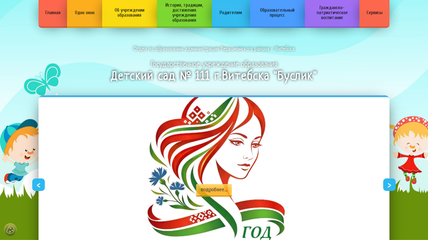 | AI-анализ | The website is for "Детский сад № 111 г. Витебска 'Буслик'". It provides information on the kindergarten, including its location in the city of Vitebsk, its administrative structure, work schedule, and contact details. The website also offers resources for parents, such as information on the application process, available spaces, and local educational resources. Additionally, the website includes sections on policies, legal documents, and social support services for students. The domain is du111.pervroo-vitebsk.gov.by. |
