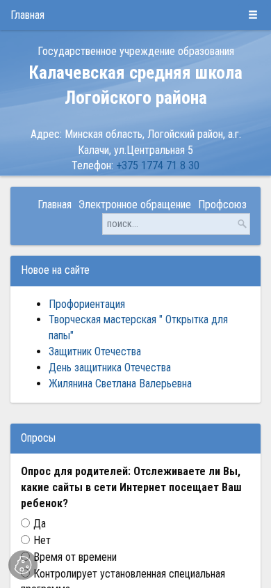 | AI-анализ | This website is for the Калачевская средняя школа (Kalachyvskaya Srednyaya Shkola) in the Lогойsky district of Belarus. The title of the website is "Калачевская средняя школа Логойского района" (Kalachyvskaya Srednyaya Shkola Logoyskogo Rajona). The description includes the address: Минская область, Логойский район, Калачи, ул. Центральная 5, and the contact information: telephone +375 1774 71 8 30, email kalachi@logoysk-edu.gov.by. The website provides information about the educational institution, including the academic year 2025/2026, admission conditions, pedagogical staff, and |
