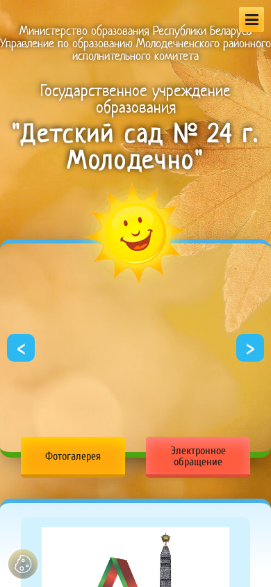 | AI-анализ | This website is for the Daycare Center Number 24 in the city of Minsk, Belarus. The title is "Детский сад №24 г.Молодечно" (Detskiy sad number 24 g.Molodechno). The description includes various sections such as "О нас" (About us), "Руководство учреждения образования" (Management of the educational institution), "Коллектив учреждения образования" (Staff of the educational institution), "Контакты" (Contacts), "История, достижения, традиции учреждения дошкольного образования" (History, achievements, traditions of the kindergarten), and "Образовательный процесс" (Educational process). The website also includes sections for "Новости учре |