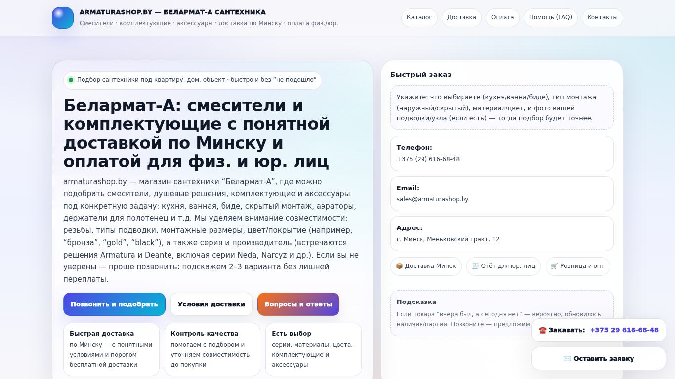 | SEO-описание | armaturashop.by — Белармат-А сантехника: смесители, аксессуары, аэраторы, серии Armatura/Deante, подбор под объект. Доставка по Минску (до 300 BYN — 15 BYN, от 300 BYN — бесплатно), оплата для физ. и юр. лиц, FAQ. |