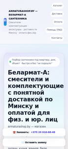 | AI-анализ | --- The website armaturashop.by is an e-commerce store for Belarusian sanitary ware and plumbing components, offering mixers, accessories, aerators, and series Armatura/Deante for selection and purchase. It provides delivery within Minsk, with different delivery fees based on the order value. Payments are accepted for both physical and legal entities, and the website features an FAQ section. The store allows customers to choose and order sanitary ware for kitchens, bathrooms, bidets, and hidden installations, taking into account compatibility factors such as threads, types of connection, mounting sizes, colors, and series. Customers can call for assistance in selecting suitable options. The website includes sections for delivery conditions, frequently asked questions, and a catalog of popular categories. |