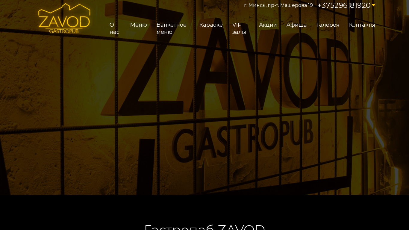 | Название / Заголовок | Гастропаб ZAVOD (Завод) — в центре Минска, с отдельным караоке и отдельной террасой. Бесплатные развлечения для гостей. Телефон: +375296181920 |
