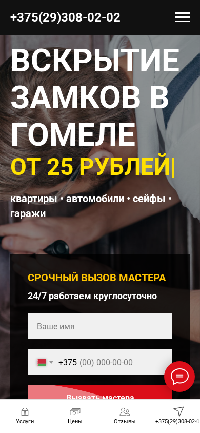 | SEO-описание | Вскрытие замков в Гомеле любой марки от 30 руб! ✔️Мастер приезжает за 15 минут по Гомелю. ✔️Производим вскрытие без повреждения двери. ✔️Гарантия на все виды работ, более 100 отзывов! Служба экстренного вскрытия замков Локсервис. Звоните +375(29)308-02-02 |