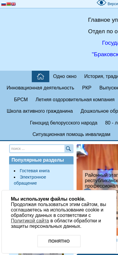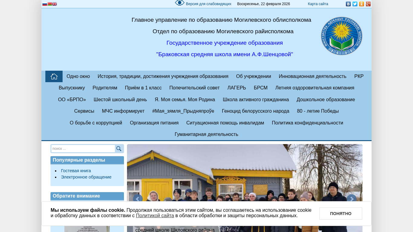 | AI-анализ | The web project "Браковская средняя школа имени А.Ф.Шенцовой" (Brakovo Middle School named after A.F.Shentsov) is a Belarusian educational institution with the domain name brakovo.mogilev.edu.by. The website uses a standard font size and a standard inter-letter spacing. The color scheme is white, and images are disabled. The top words on the website include "далее," "читать," "2026," "йская," "новости," "республики," "беларусь," "смотри," "нская," "брпо," "безопасность," "сайта," "учреждения," "проекта," "жизни," "школа," "крэольская," "лац," "кар |