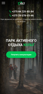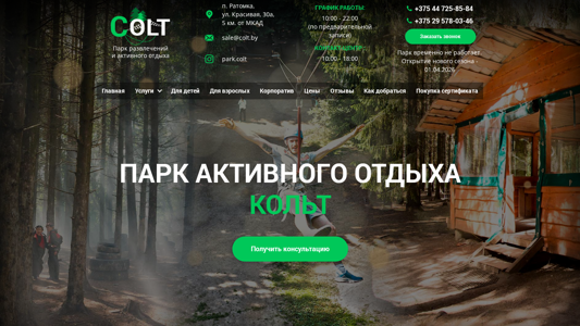 | AI-анализ | This online resource represents the website for Park Active Rest and Entertainment Colt.by, located in the suburb of Pushkin, 30a Krasyva Street, 5 km away from the Minsk ring road. The park offers various activities for children and adults, including paintball, laser tag, quests, a rope town, gazebos, and many more. The contact numbers are +375 44 725-85-84 and +375 29 578-03-46. The park currently is closed, with the new season opening on April 1, 2026. The services offered include paintball, laser tag, quests, children's activities like a graduation for children, a climbing wall, shooting range, a covered park for children, and catering services. The park also provides transfer services, |
