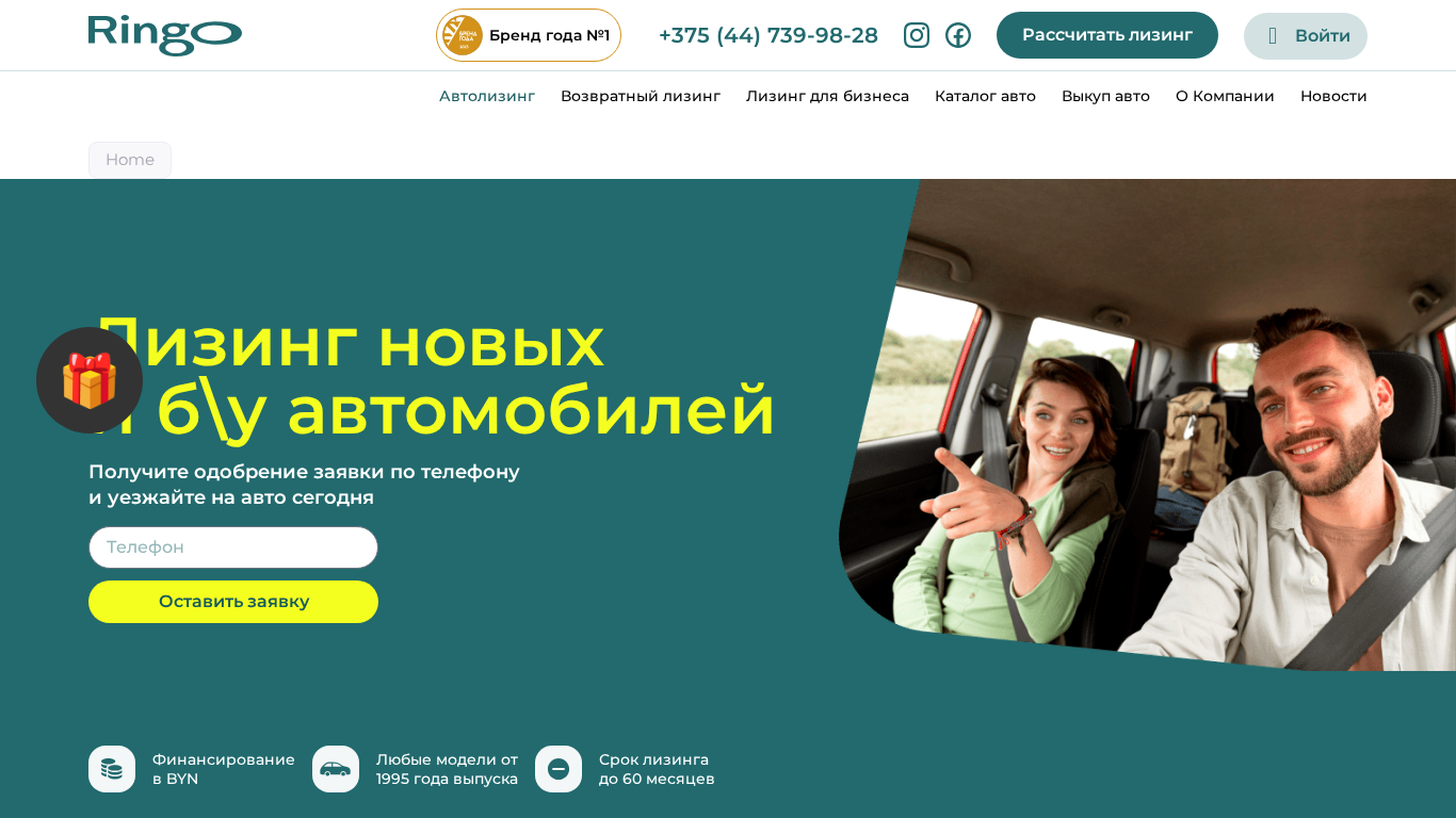 | AI-анализ | The website "Ringo" is a Belarusian auto leasing company. The description mentions the keywords "лизинг" (leasing), "авто" (auto), "автомобилей" (autos), "выкуп" (purchase), "года" (years), "телефон" (phone), "каталог" (catalog), "финансирование" (financing), and "новости" (news). The top words are "лизинг" (leasing), "авто" (auto), "автомобилей" (autos), "выкуп" (purchase), "года" (years), and "телефon" (phone). The website offers various types of auto leasing, including new and used cars, with financing available in Belarusian currency (BY |