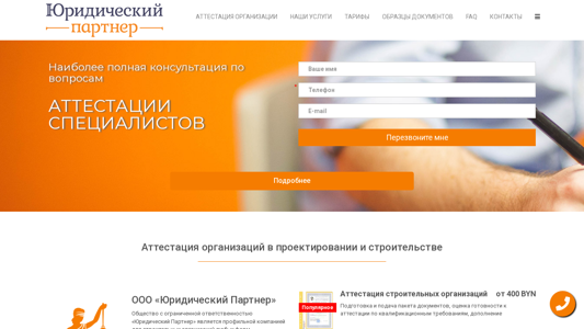 | AI-анализ | The website is a legal consulting firm specializing in certification and certification services in the construction industry. The company offers help with the certification of organizations in construction and design, as well as registration of legal entities and liquidation of companies. The website provides information on certification of industrial safety and fire safety activities, certification of work in construction, and ISO 9001 certification for annual confirmation. The company offers services related to licensing, business activities, and certification for construction work in the Russian Federation. The site also includes tariffs, document templates, and an FAQ section. The most complete consultation on specialist certification is available. The company is a full-cycle organization providing all types of document acquisition services. Their qualified specialists will answer all questions for free. Popular services include certification of construction organizations starting from 400 BYN, preparation and submission of documentation packages, evaluation of readiness for certification according to qualification requirements, and development and implementation |
