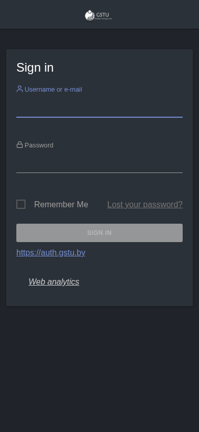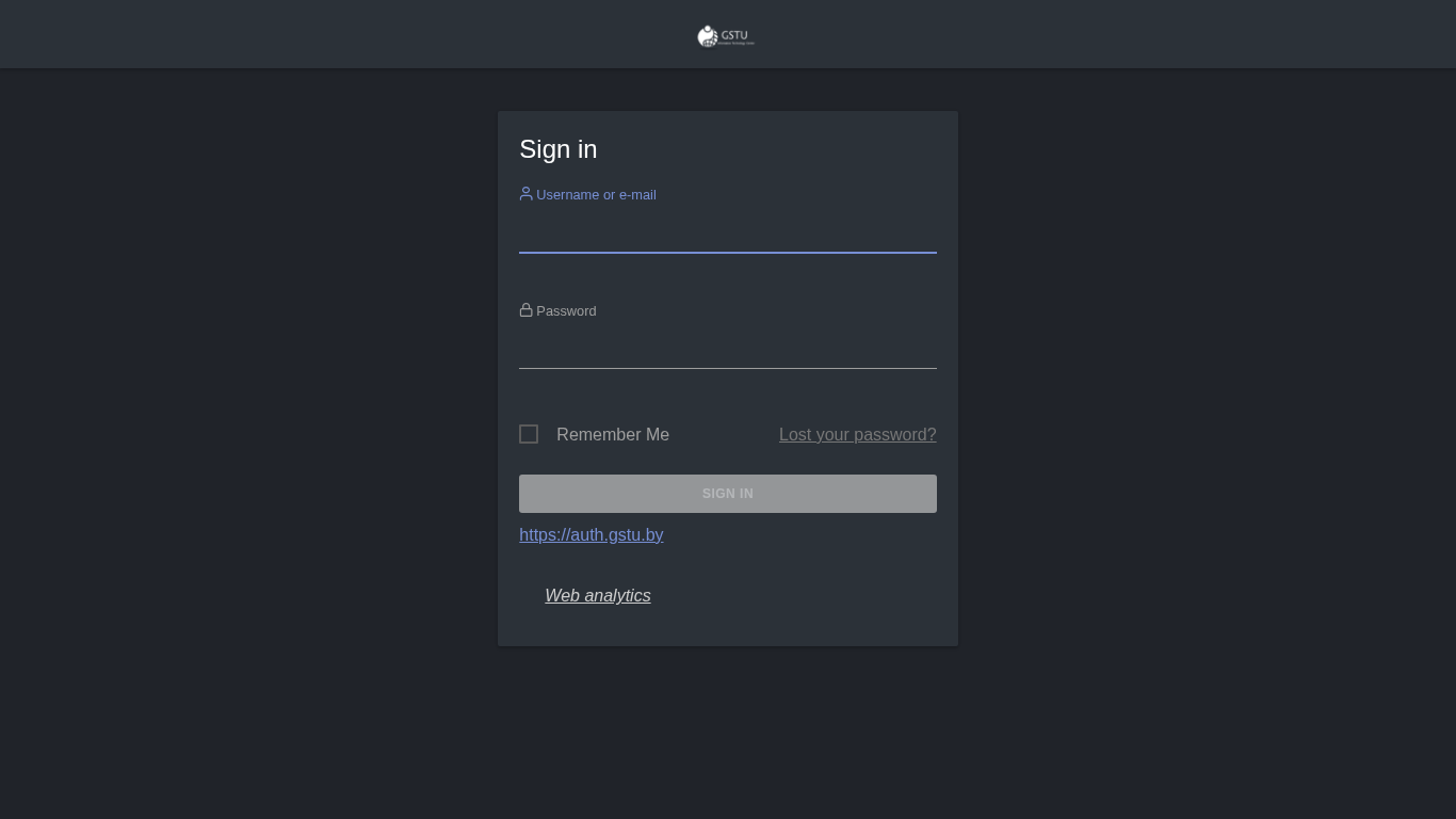 | AI-анализ | This website is the sign-in page for the Matomo analytics platform on the domain stats.gstu.by. Users can sign in using their username or email address and password. The page includes options to remember the login and a link for lost passwords. The analytics platform is described as free/libre. |