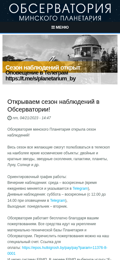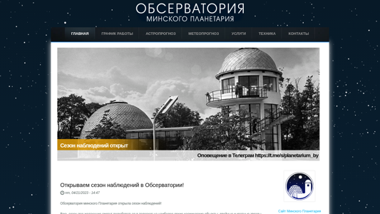 | AI-анализ | The website is for the Observatory of Minsk Planetarium. It provides information about the opening season for astronomical observations. The season lasts from April to October and visitors can observe various celestial objects such as double and multiple stars, star clusters, galaxies, planets, the Moon, the Sun, and more. The observatory operates for free, relying on donations to maintain its equipment and facilities. Visitors can make donations through a special account or via the ERIP system. The observatory's schedule includes evening observations from Wednesday to Sunday, daytime observations on Saturdays and Sundays, and closed on Mondays and Tuesdays. The observatory's Facebook page and Telegram channel can be used to receive updates on the observing schedule. The website also includes information about the planetarium and its regular operation, as well as an events calendar. |