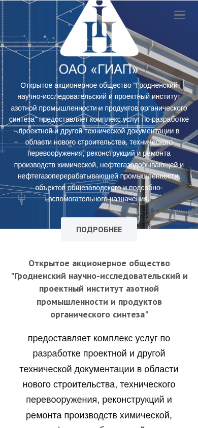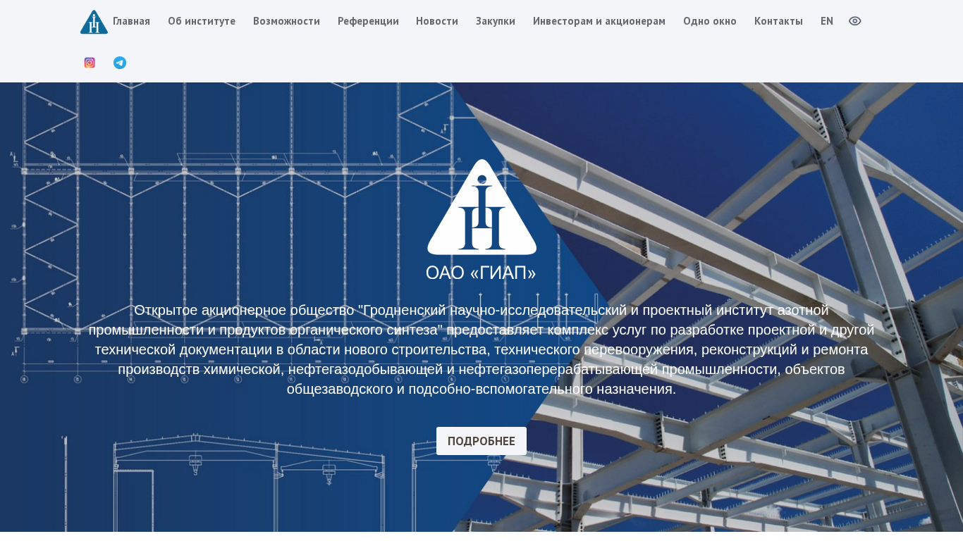 | AI-анализ | --- This website belongs to Гродненский научно-исследовательский и проектный институт азотной промышленности и продуктов органического синтеза (Grodno Research and Project Institute for Azot Industry and Organic Synthesis). The title of the website is reflected in the name of the organization. The website provides information about the institute, its history, staff, events, licenses, management, structure, and services. Keywords associated with the website include 'гиап' (Grodno Institute for Applied Problems), 'оао' (open joint stock company), '375', 'giap', 'промышленности' (industry), '152', 'институт', 'события' (events), '2026', 'гродненский', 'научно |
