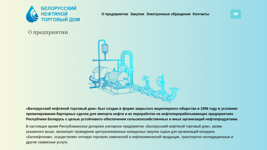 The portal "БНТД — Белорусский нефтяной торговый доm" was established in 1996 as a closed joint-stock company in the context of prevalent barter deals for the import and refining of oil on petrochemical enterprises in the Republic of Belarus, with the goal of stable supply of petroleum products to agricultural and other organizations. Currently, the Republican Unitary Enterprise "Белорусский нефтяной торговый дом" not only fulfills this function but also organizes centralized tender purchases for organizations within the Belneftekhim Concern, conducts wholesale trade in chemical and petrochemical products, and provides transport-logistics and other service services. Contact information includes the address at 220083, Republic of Belarus, Minsk, prospect Dzerzh