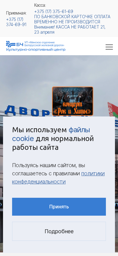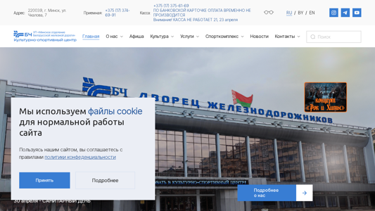 | AI-анализ | The website is for the Minsk Branch of the Belarusian Railways Cultural and Sports Center. The address is given as Ul. Chkalova, 7 in Minsk. The website provides information about the center's services, including culture, sports, and rental of facilities for events. The contact details include a phone number for the reception and one for the cash desk, both of which are currently not accepting bank card payments and are closed on April 21 and 23. The website also mentions a sport complex that is currently not operating on April 21. The top keywords include '375', 'Чкалова', 'минск', 'касса', 'зал', 'апреля', 'стоимость', 'рублей', 'все', 'народная', 'марта', 'работает', 'нас', 'дворца', ' |