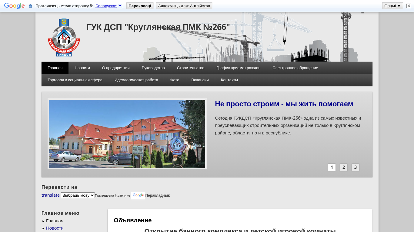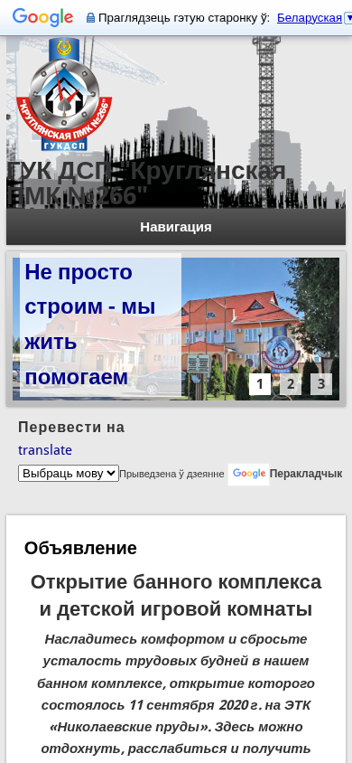| AI-анализ | This website is for the state unitary enterprise "Krulyansky District Production Association No. 266" (PMK-266) in Belarus. The website provides information about the organization, its leadership, construction projects, and services, including a catering unit, events, and ideological work. The website also features a photo gallery and job vacancies. PMK-266 is known for its successful construction projects not only in the Krulyansky district and region but also in Belarus as a whole. The website promotes the organization's role in the development of the construction industry in Belarus and highlights its impact on the community of Krugloe, which has been transformed into a model town with the support of social infrastructure. The website also announces the opening of a bathing complex and children's playroom at the "Nikolayevski P |