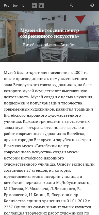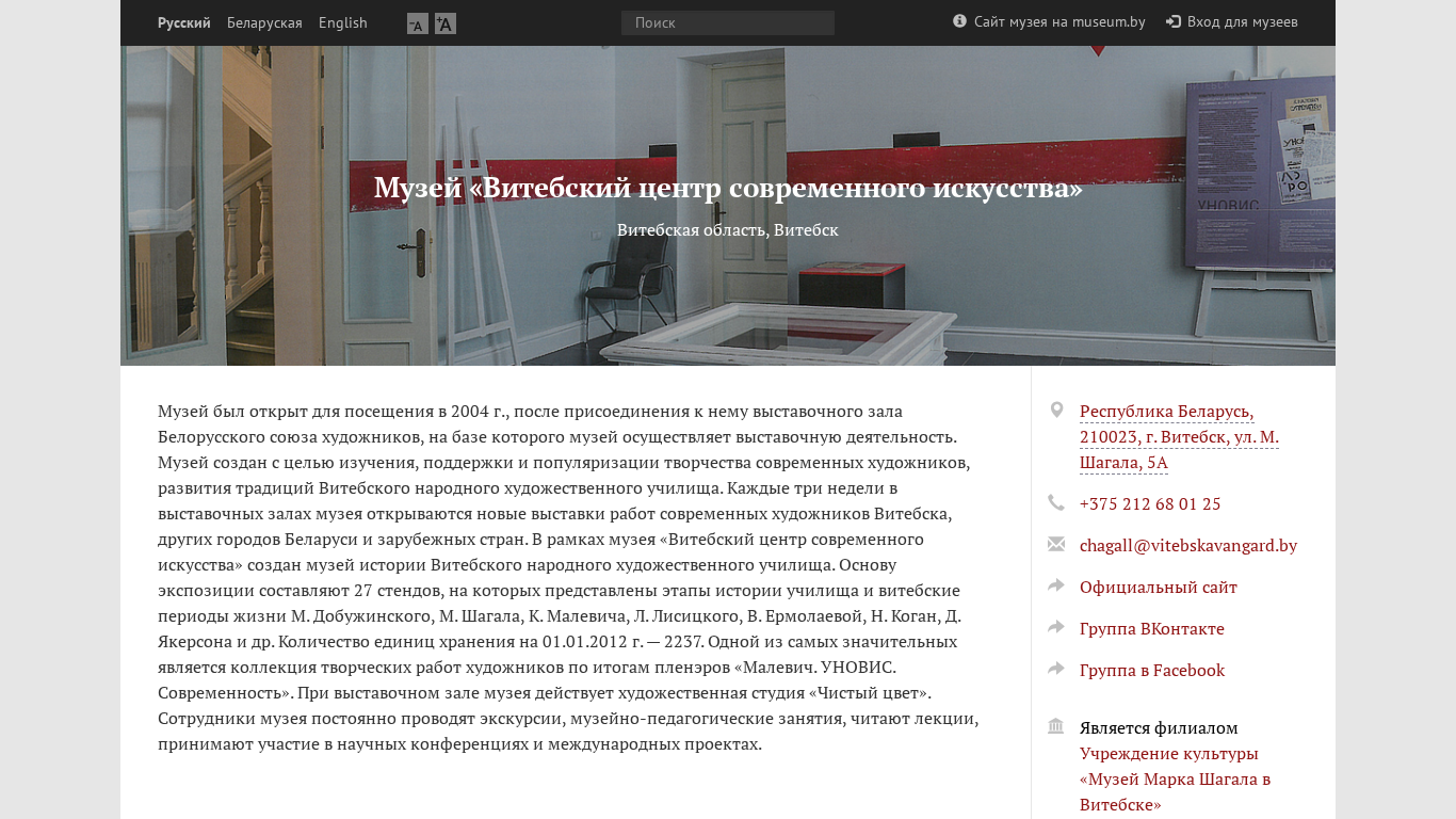 This online resource, artvitebsk.museum.by, is the website of the Museum of the Contemporary Art Centre in Vitsebsk, Belarus. The site provides news and event information, visitor details, pricing, exhibition details, collections, and materials for museum professionals. Keywords associated with the site include museum, art, Vitsebsk, centre, contemporary, art, site, museums, Vilnius, created, modern, contemporary art, and Vitsebsk People's Art School. The museum was established in 2004, when it absorbed the exhibition hall of the Belarusian Union of Artists, serving as the venue for its exhibition activities. The museum aims to study, support, and promote contemporary art, and to continue the traditions of the Vitsebsk People's Art School. Every three weeks, new exhibitions of contemporary artists from Vitseb