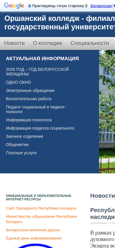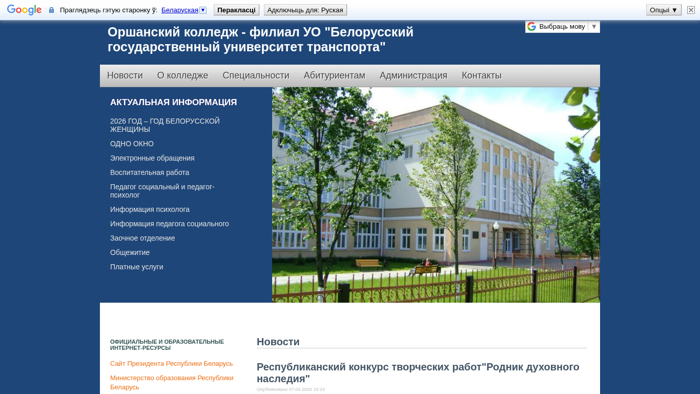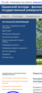| AI-анализ | The web project "Orshansky College - Branch of the Belarusian State University of Transport" (ogkjt.bsut.by) is the official website for the Orshansky College - Branch of the Belarusian State University of Transport. The site provides news about the college, specialties for students, administration information, contacts, and current information. Topics include educational resources, the president of the Republic of Belarus, the Ministry of Education, and Belarusian Railways. A video titled "Живое дыхание прошлого и настоящего" is presented in the "Родник духовного наследия" section, which is part of a republican contest for creative works dedicated to the memory of a Hero of Belarus, Patriarchal Exarch of all Belarus Mitropolit Filaret (Vahromeev), |