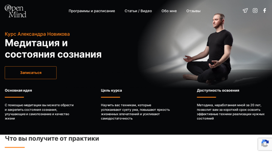| AI-анализ | Портал openmind.by предлагает онлайн-семинары по медитации и состоянию сознания. Сайт предоставляет информацию о курсах и занятиях для начинающих в йоге, ведущих Александр Новиков. Посетители могут научиться техникам успокоения ума, повышению самосознания и улучшению качества жизни. Методология, разработанная инструктором за 20 лет, позволяет быстро овладеть эффективными методами достижения желаемых состояний. Практика этих методов приводит к прекращению внутреннего диалога, миру ума, увеличению интенсивности жизненных переживаний, присутствию в моменте и общему чувству целостности, самодостаточности и развитию внутренних ресурсов. Курс подходит как для лиц без предыдущего опыта медитации, так и для тех, кто имеет значительный опыт практики. Программа включает в себя методики медитации для достижения конкретных состояний сознания, способствующих самопознанию и улучшению качества жизни. |