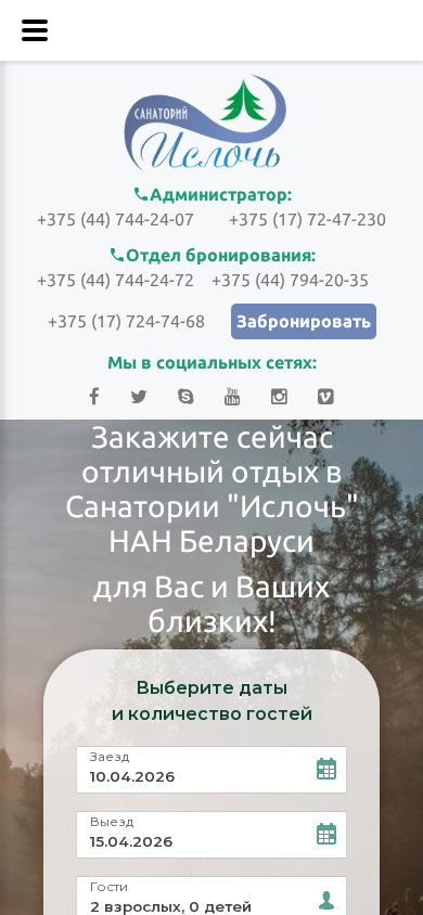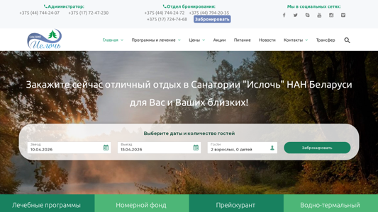 | Ключевые слова | Ислочь Официальный сайт санаторий Ислочь заказать online забронировать путёвку онлайн Беларусь Белоруссия санатории Беларуси санаторий НАН РБ здравница отдых санаторно-курортное лечение |