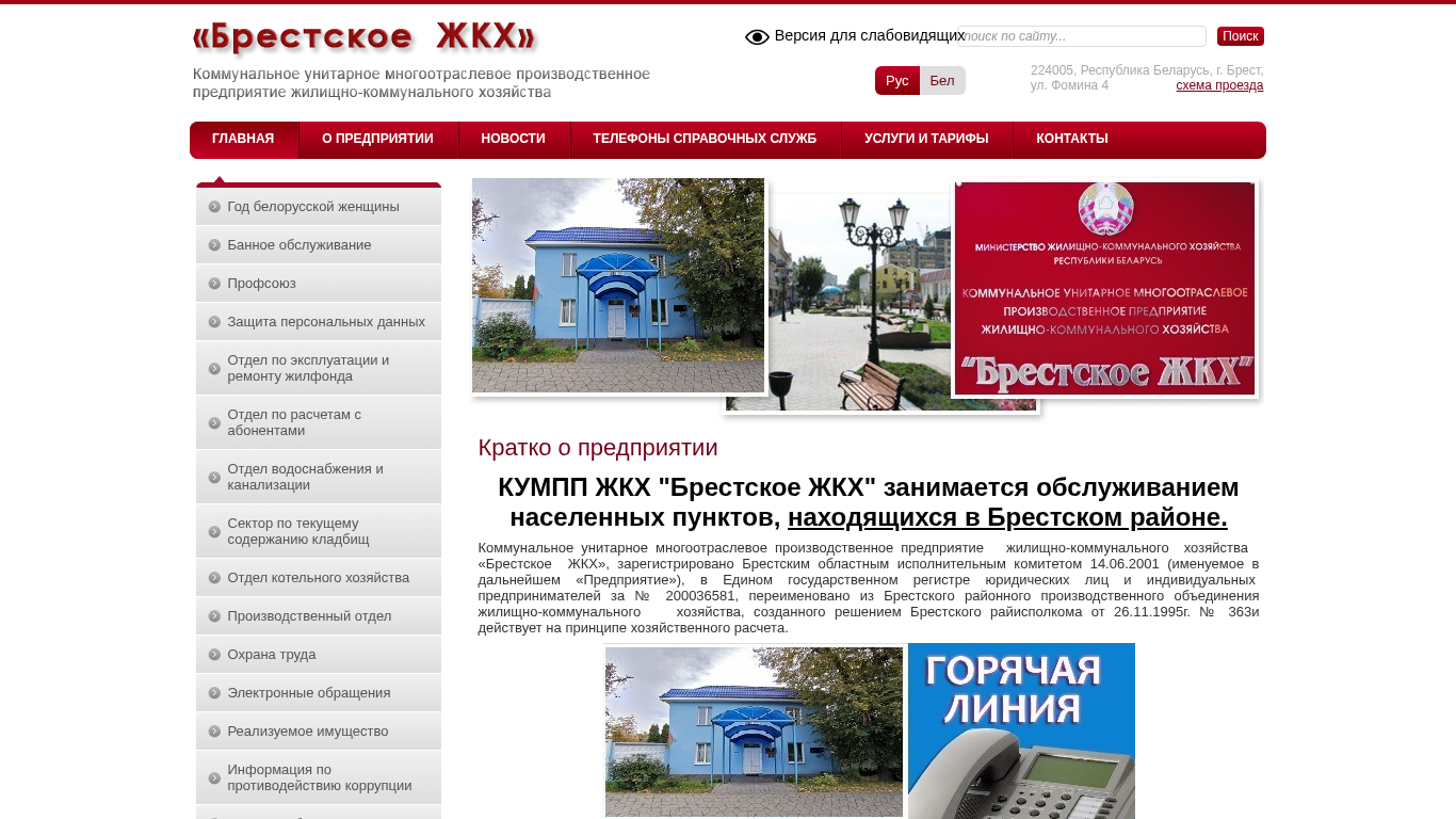 | Адрес | Коммунальная грамотность, Вакансии, Пятилетка качества, Контактная информация, КУМПП ЖКХ "Брестское ЖКХ", ул. Фомина 4 |