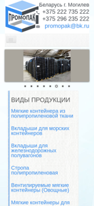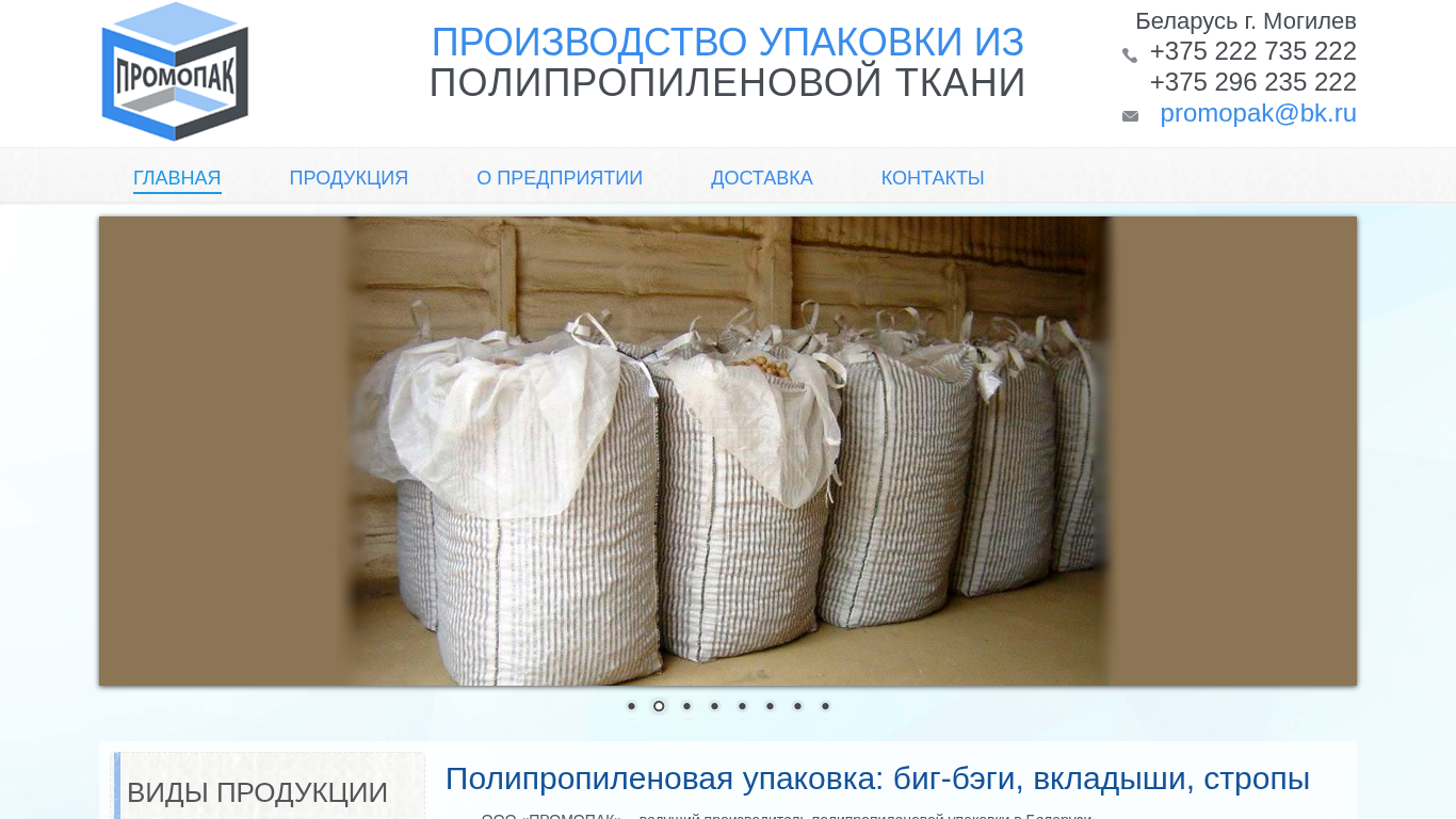 | SEO-описание | Купить биг-бэги, упаковку из полипропилена в Могилеве. ООО Промопак собственное производство упаковки. В наличии большой выбор упаковки для транспортировки сыпучих грузов. Вся продукция надёжна, герметична, обладает высокой прочностью. Тел. +375 222 735 222. г. Могилев, ул. Кулибина, 8. |