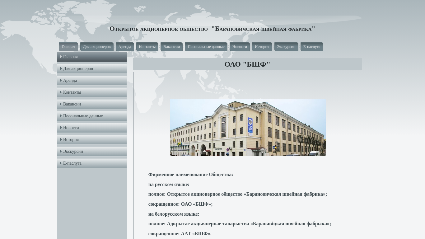 | Адрес | сокращенное: ААТ «БШФ»., Почтовый адрес: Республика Беларусь, 225404, Брестская область, г. Барановичи, ул. Войкова, 2 |