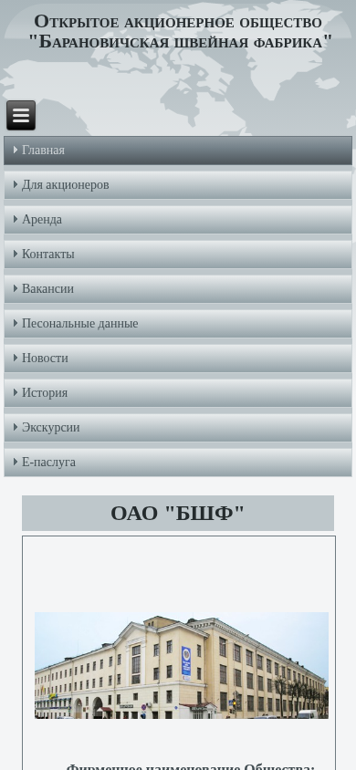 | AI-анализ | The portal OAO "БШФ" (Open Joint Stock Company "Baraновичskaya Shveynaya Fabrika") is a website primarily targeted at shareholders of the company. It provides access to various shareholder-related information such as annual reports, minutes of meetings, and financial statements. The portal includes sections for archived reports, auditor's reports, and budgetary information. Additionally, it offers information on the company's history, news, and contact details. The company, whose full name is "Открытое акционерное общество «Барановичская швейная фабрика»", is located in Baranovichy, Belarus, and specializes in the production of clothing under the brand "ТВОЕ". The website also includes sections for vacancies, personal data, and electronic applications. The domain is registered as |