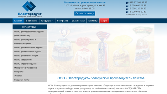 Портал ООО "Пластпродукт" — белорусская компания по производству упаковки. Расположенная в Минске, она специализируется на выпуске различных видов упаковочных изделий с использованием плёнки CAST (SRR) полипропилена, а также других вариантов упаковки из полипропилена и полиэтилена. В ассортименте продукции представлены упаковка для кондитерских изделий (винетты SRR), птицы, мяса, продуктов питания, товаров гигиены, текстиля, зелени и овощей, а также материалы под вакуум и с маркировкой. Компания предлагает индивидуальный подход к клиентам, конкурентоспособные цены и быстрое выполнение заказов, обеспечивая профессиональный сервис, безопасность и экологичность. В контактной информации представлены местные и международные номера телефонов.