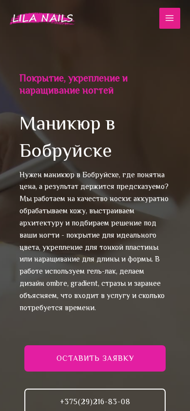 | SEO-описание | Маникюр в Бобруйске: маникюр цена, классический/аппаратный/комбинированный, покрытие гель-лаком, укрепление гелем и полигелем, наращивание ногтей, коррекция, французское покрытие, ombre/gradient и стразы. Прайс и запись. |
