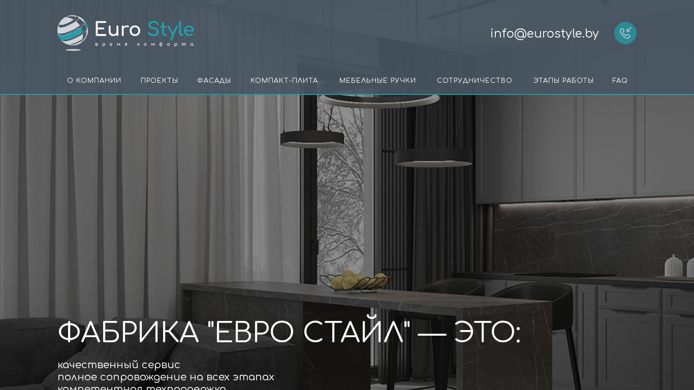 Проект веб-сайта EuroStyle - време комфорта (Time of Comfort) является сайтом компании EuroStyle Factory, крупного современного производителя мебели. Сайт предоставляет информацию о компании, её проектах и этапах производства, фасадах, компактных ламинированных панелях, мебельных ручках (мебельные ручки в русском переводятся как "мебельные ручки", что в английском означает "фurniture handles"), а также возможности для сотрудничества. EuroStyle Factory предлагает комплексный сервис по производству мебели и кухонь, обеспечивая квалифицированную техническую поддержку на всех этапах процесса. Компания успешно работает на рынке с 2008 года, завоевав репутацию благодаря профессиональным подходам, современным дизайнерским решениям и уникальным разработкам по разумным ценам. EuroStyle Factory производит кухни и любую другую мебель по индивидуальным проектам, имеет значительный опыт работы с девелоперами, дизайнерами и другими заказчиками.