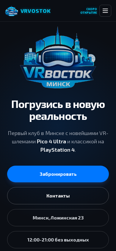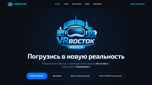 | SEO-описание | VRvostok — современный VR-клуб в Минске (Уручье). Новейшие VR-шлемы Pico 4 Ultra, зона PlayStation 4, огромный выбор игр. Приходите за новыми эмоциями на Ложинскую 23! |