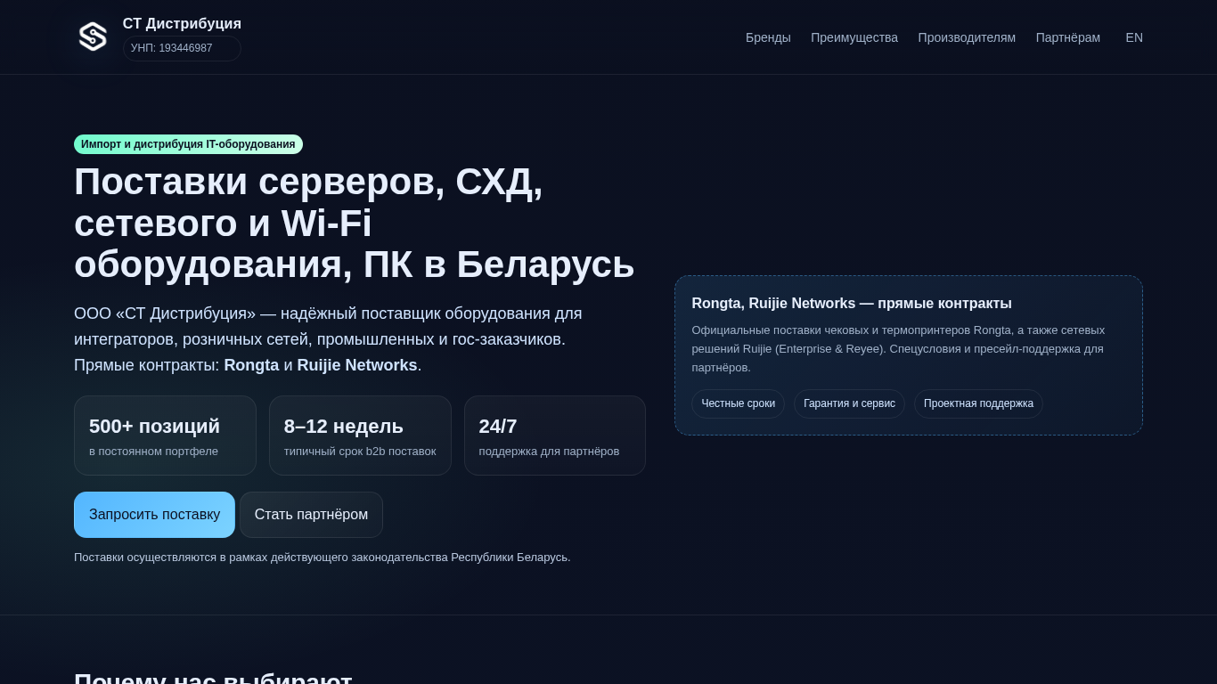 | SEO-описание | ООО «СТ Дистрибуция» — поставки серверов, СХД, сетевого оборудования, ПК и периферии в Республику Беларусь. Прямые контракты: Rongta, Ruijie Networks. Партнерская программа для интеграторов и реселлеров. |