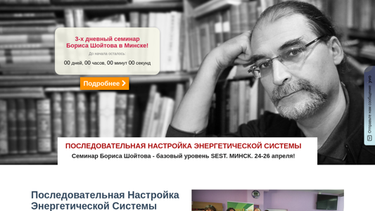 | AI-анализ | The portal is a website dedicated to a three-day seminar by Boris Shoytov in Minsk, Belarus, titled "Sequential Energy System Tuning" (SEST). The event, which takes place from April 24-26, focuses on alternative medicine, specifically Chinese traditional practices such as acupuncture and the cranial system. Boris Shoytov, the founder of the SEST method, will personally conduct the seminar, providing participants with an immersive learning experience. The program covers the fundamental principles and practices of SEST, allowing attendees to diagnose hidden causes of health issues using natural methods without the need for equipment or medication. The unique method emphasizes the importance of balancing the energy system, which is crucial for overall well-being and a happy life. Boris Shoytov and Jan Berg's long-term practice revealed correlations between |