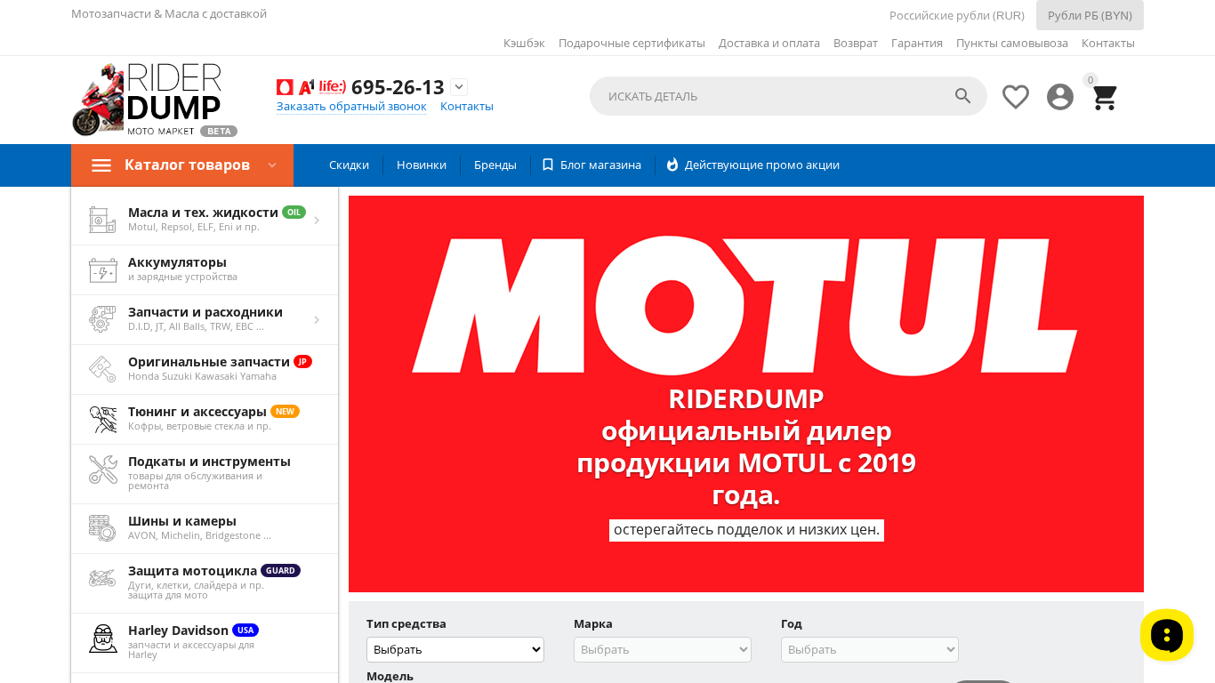Сайт RIDERDUMP представляет собой онлайн-магазин мототехники и масла, расположенный в Беларуси. Он специализируется на предоставлении мотоклубам широкого спектра товаров, включая детали, масла и аксессуары от различных брендов, таких как Motul, Repsol, All Balls, EBC, D.ID, JT, Michelin, HiFlo, HEL Performance, CrazyIron. На сайте присутствует удобная система поиска для нахождения подходящих деталей конкретному мотоциклу. Покупателям также доступны постоянные акции и уникальные системы скидок. Каждый заказ сопровождается возвратом 3% на личный счет. В магазине представлены услуги доставки и оплаты, а также политики возвращения и гарантии. Доступна информация для обращений от клиентов, а также пункты выдачи для тех, кто предпочитает физическое получение товара. Каталог включает разделы по маслам, трансмиссионным жидкостям, тормозной системе, фильтрам и двигательным частям.