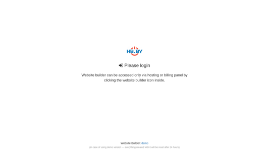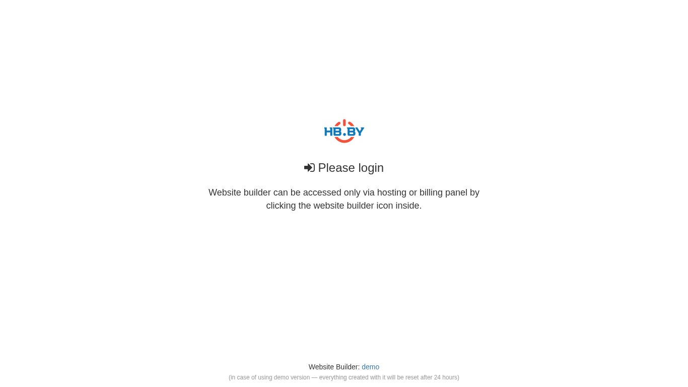 This website, titled "Конструктор сайтов HB.BY" (HB.BY Website Builder), is a login-required webpage dedicated to website building. It can be accessed exclusively through hosting or billing panels by clicking the designated website builder icon. The platform offers a demo version, which is useful for testing purposes but resets all created content after 24 hours. The domain associated with this website is sb.hb.by.