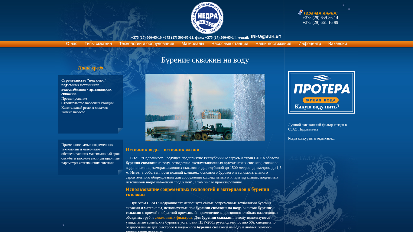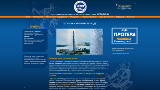 | AI-анализ | The website is dedicated to water well drilling in Minsk and the Minsk region for private household water supply. The company offers water well drilling services in Minsk, Belarus, and CIS countries. The website provides information on water well drilling technologies and materials, as well as the construction of pumping stations, capital repairs of wells, and pump replacement. The company uses modern technologies and materials for the construction of artesian wells, ensuring maximum service life and high operational parameters. The company, SZAO "Nedrainvest," is a leading enterprise in Belarus and CIS countries in the field of water well drilling, exploration and exploitation of artesian wells, deep wells, and other types of wells, with a drilling depth of up to 1500 meters and a diameter of up to 1.5 meters. The company owns a |